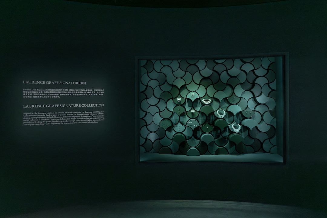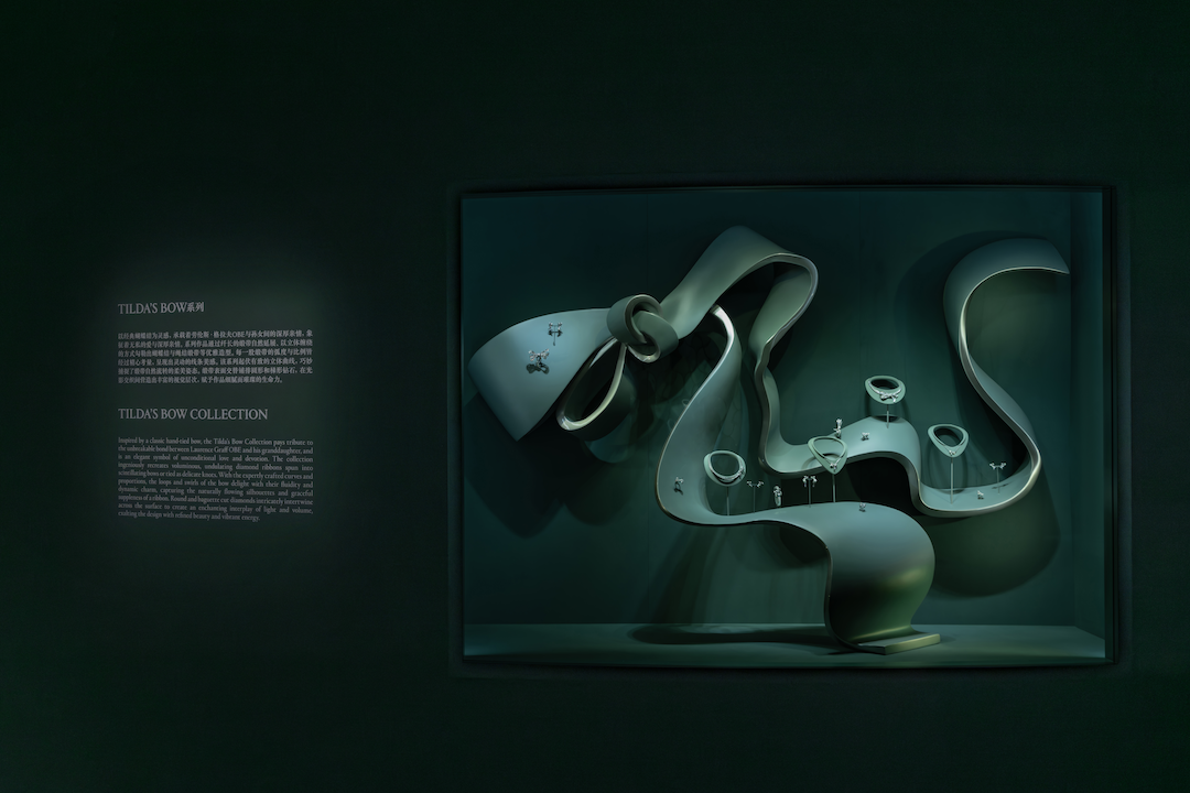 以格拉夫标志性图案铺陈作背景,Butterfly、Tilda's Bow、Wild Flower以及Laurence Graff Signature等系列,出现在“经典系列”空间,它们拥有各自的灵感源头,Tilda's Bow源自劳伦斯为孙女系上蝴蝶结的瞬间。