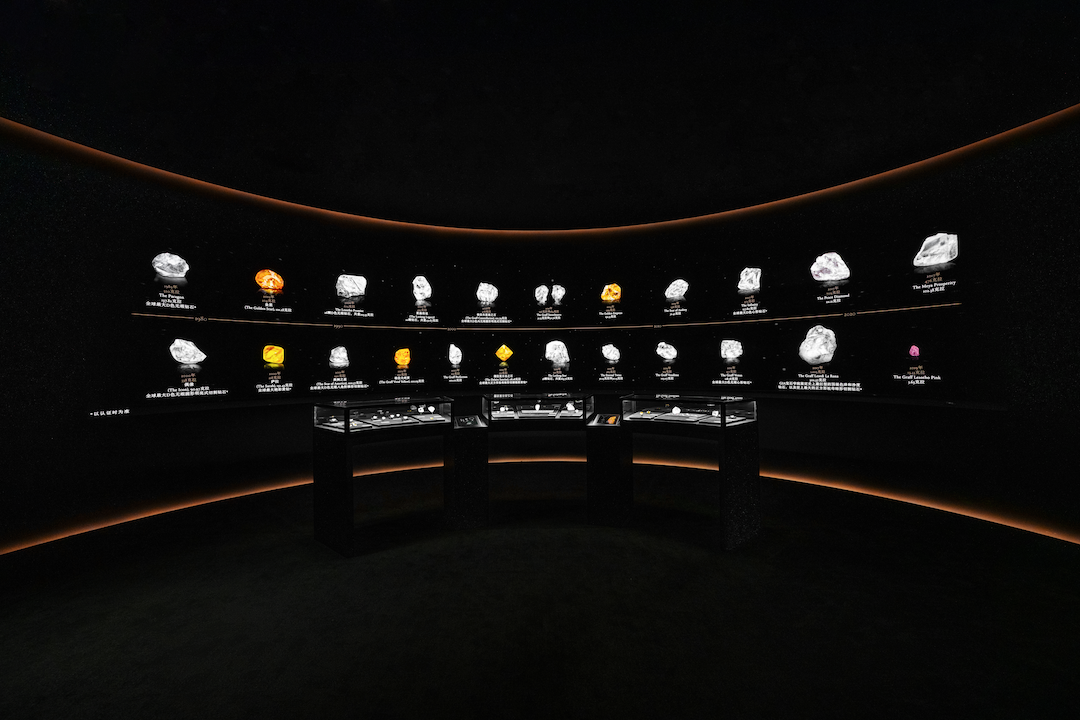 步入展览的第一个空间,整墙巨幕展现格拉夫经手的众多稀世名钻,不同的色泽与切割,群星璀璨。现场以等比例复制件,再现了几枚名钻从原石到切割的过程。