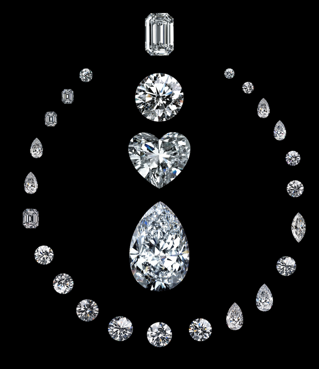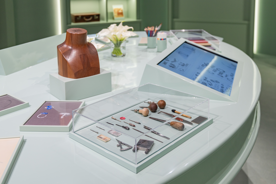 随着脚步深入,珠宝作品依次登场。空间设计以几何图形加镜面反射,象征着钻石的经典切割,从圆形明亮式到祖母绿、梨形、心形、马眼形等不同形状,表现着女性不同风格的美。