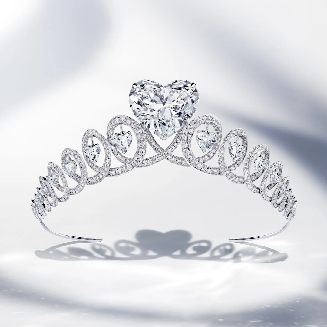 这颗心形钻石被命名为The Infinity Diamond,以其为中心,格拉夫设计创作出一顶冠冕,以18颗心形钻石环绕,流畅的雕塑线条衬托出钻石璀璨的光芒——是大自然的奇迹,是浪漫的巅峰。这顶冠冕也因此被称为The Graff Infinity Diamond冠冕。