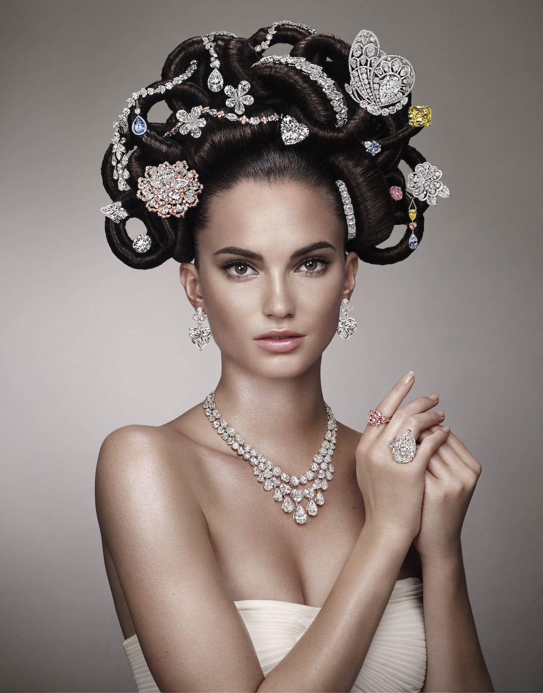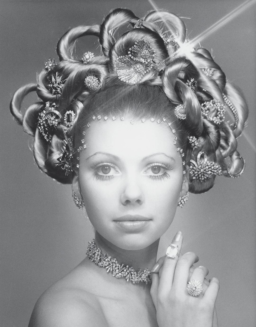 半个多世纪里,劳伦斯不断震惊业界。1970年格拉夫发布了一幅广告大片,年轻模特将浓密秀发编织于头顶,发间沉甸甸地戴满大量华贵珠宝。些许洛可可风格,又年轻狂野。这一形象在印刷时代横扫全球各大报纸杂志。
