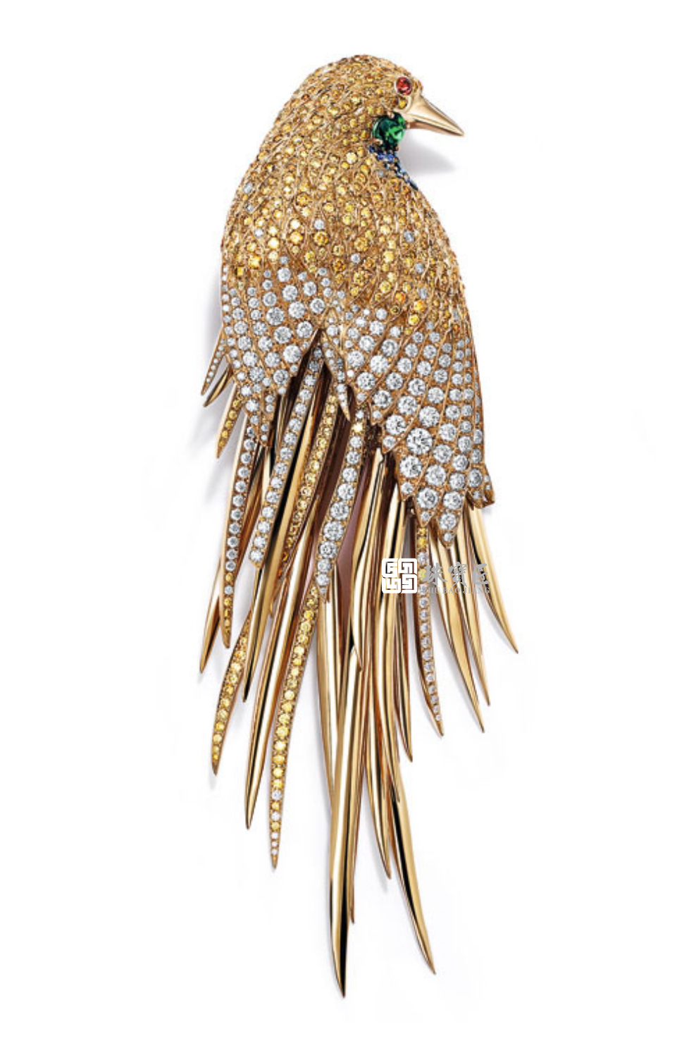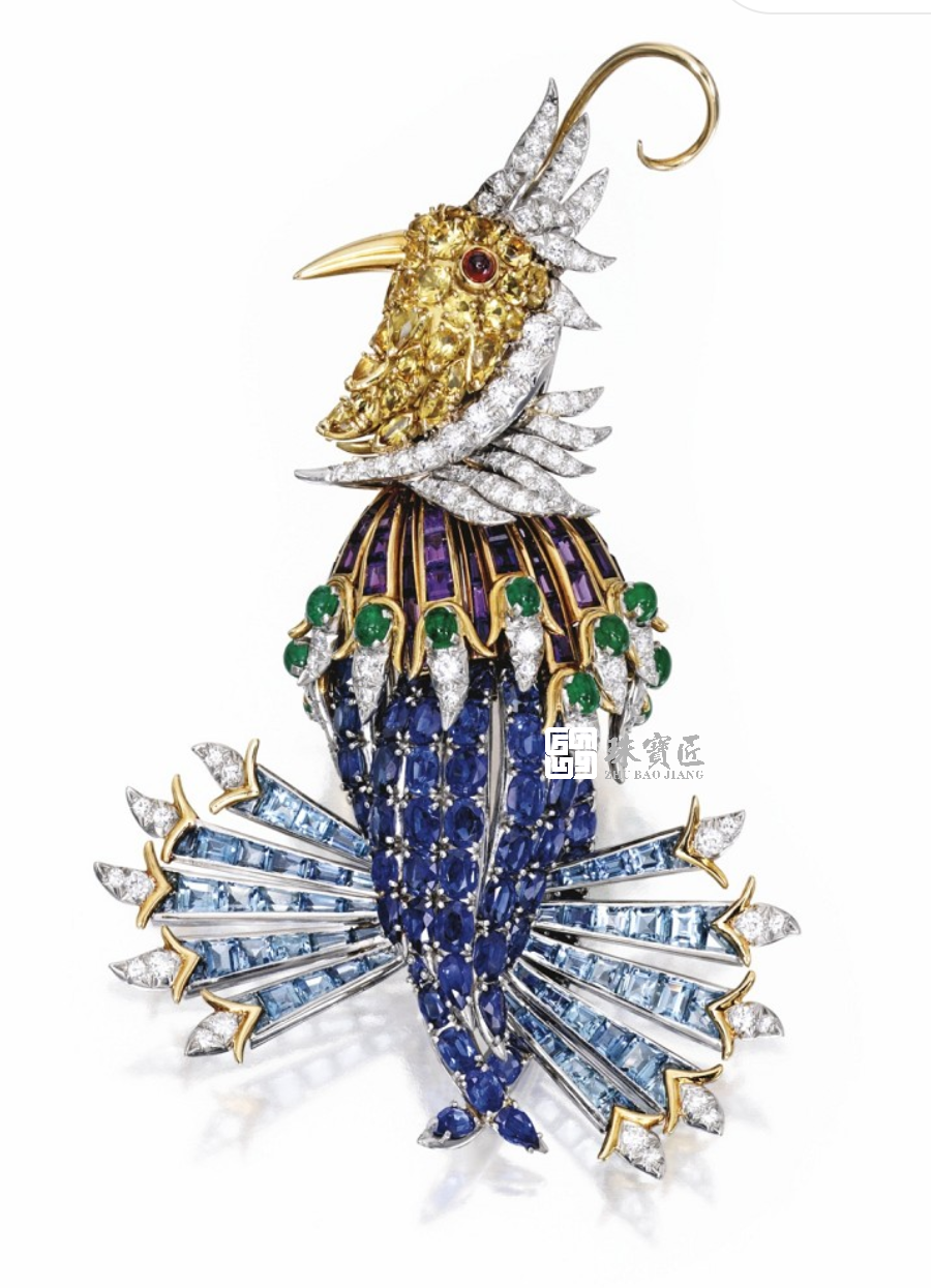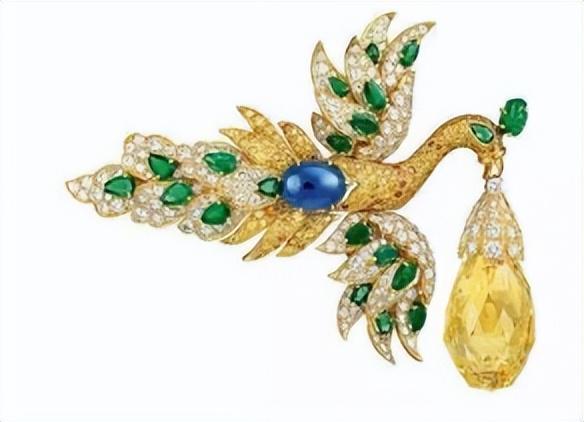 梵克雅宝于 1971 年创作的一枚凤凰胸针则堪称经典,凤凰口中叼着一枚重达 96.62 克拉的黄钻,其羽毛由钻石和祖母绿等宝石镶嵌而成,整体造型华丽而灵动。