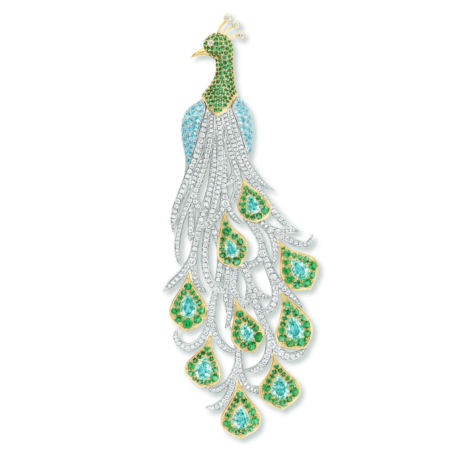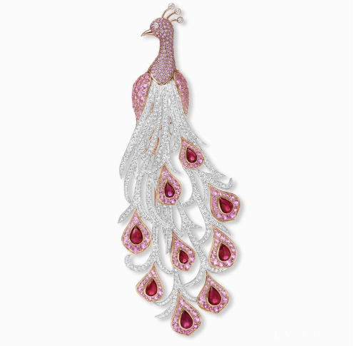 海瑞温斯顿的孔雀珠宝着重描绘曼妙的背影,长长的尾羽镶嵌不同颜色的宝石,十分惊艳。