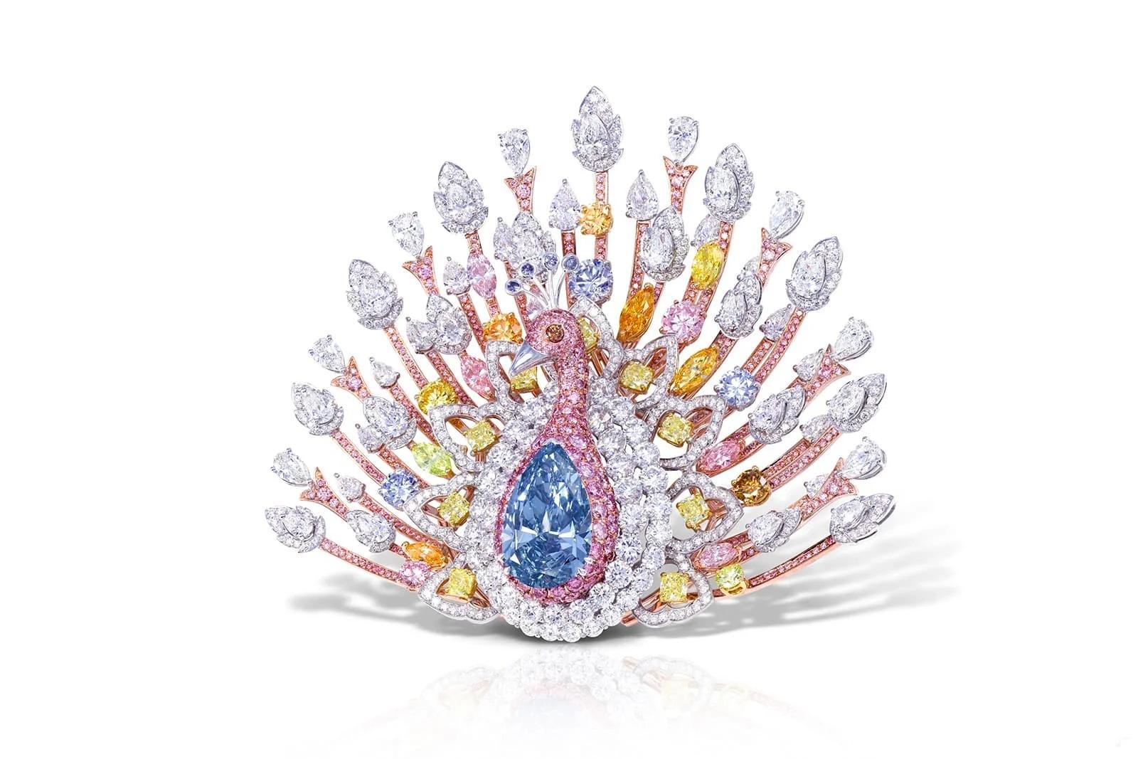 格拉夫的孔雀胸针则以壕气取胜。这枚镶嵌了1,305颗钻石,总重达120.81克拉的孔雀胸针,是当之无愧的“世界第一贵”——价值1亿美元。一颗20.02克拉的梨形艳彩深蓝钻石,被白色、粉色、黄色、橙色和绿色钻石环绕着,熠熠生辉,令人目眩。