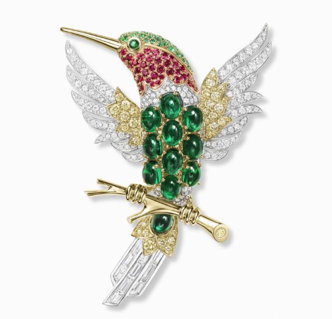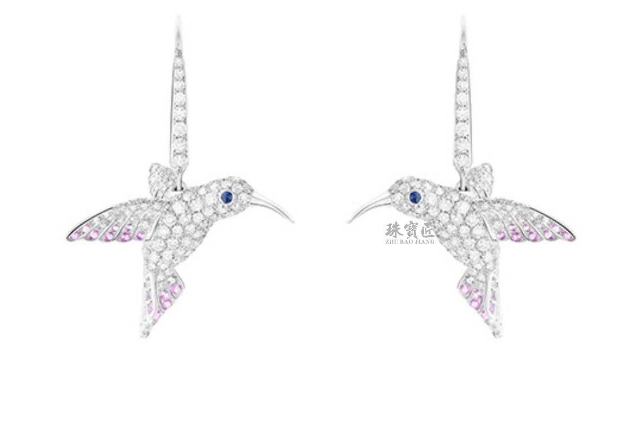 蜂鸟珠宝通常以蜂鸟的轻盈姿态、绚丽色彩和独特飞行方式为灵感来源。如海瑞温斯顿的蜂鸟胸针,以蜂鸟吸食花蜜的瞬间为灵感,鲜活灵动的形象跃然于眼前。