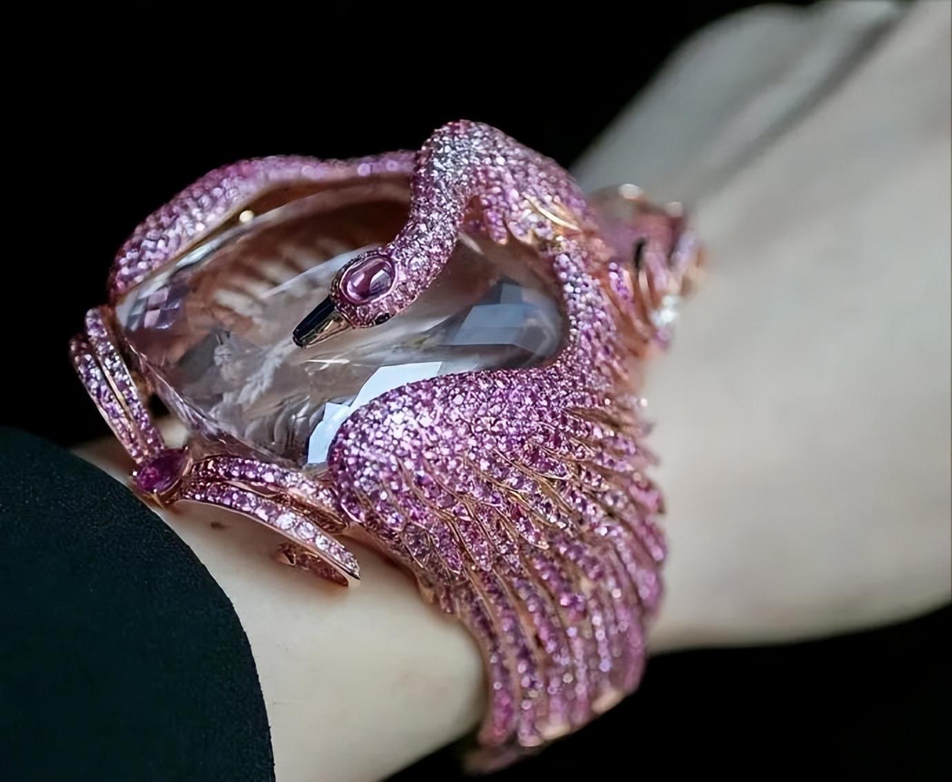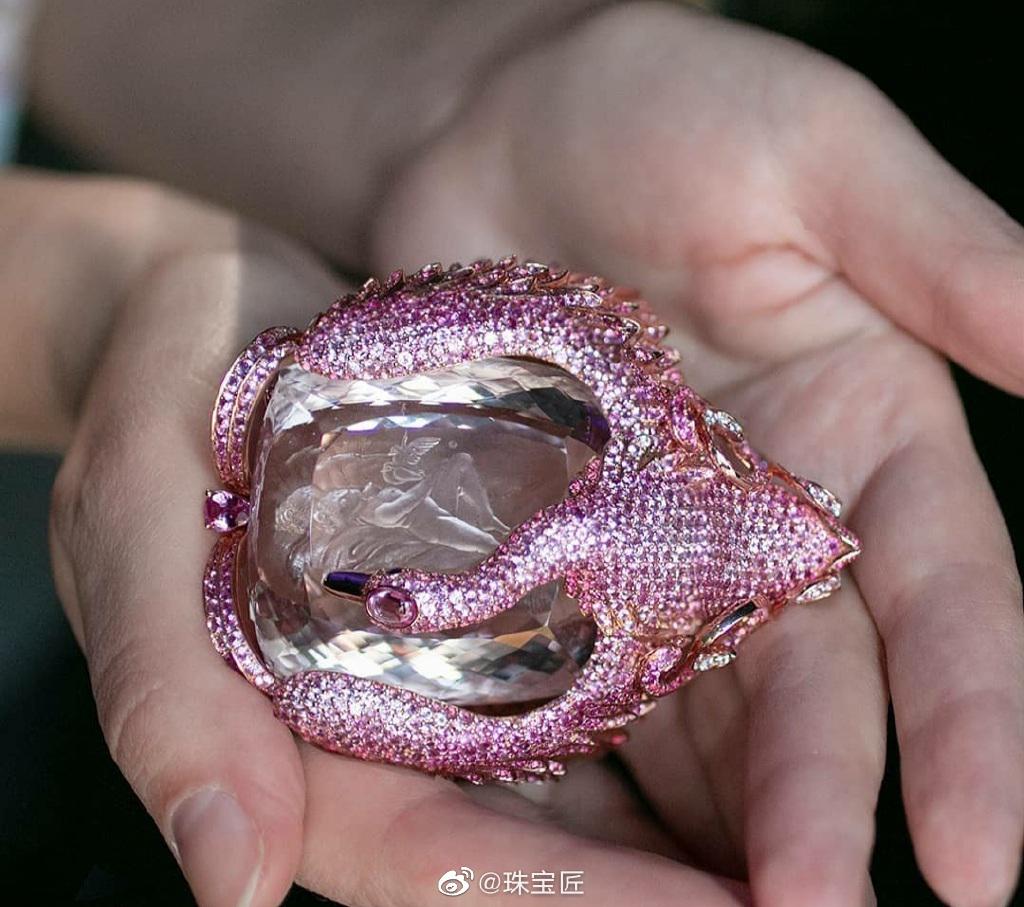 鬼才设计师Lydia Courteille则以十二星座中双子座传说为灵感,主石选用一颗重达354ct摩根石,粉天鹅的造型取材于有名的化身狂魔宙斯。