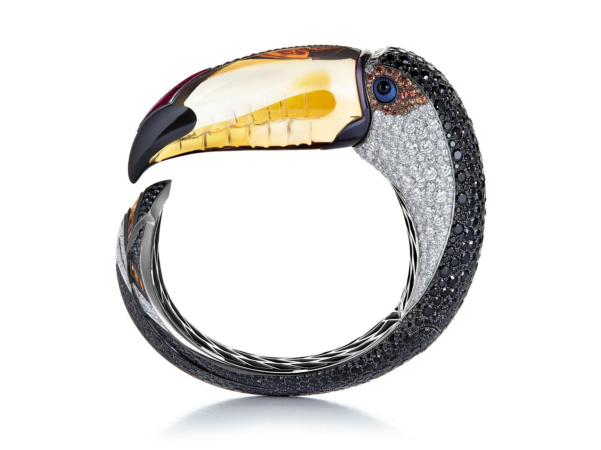 宝诗龙 Toucan 巨嘴鸟手镯来自2022 年的新高级珠宝系列「Carte Blanche, Ailleurs」。整枚手镯由白金打造,半开放结构镯壁的两端分别延伸为巨嘴鸟的头部和尾巴,造型独特,颜色鲜明,趣味十足。