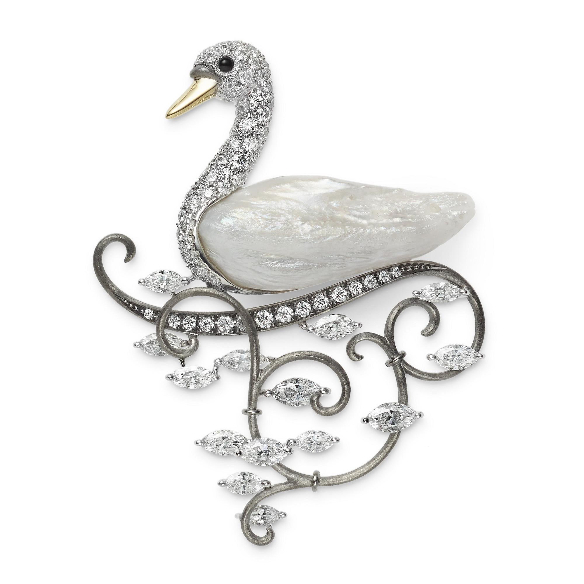 御本木的天鹅胸针以一颗巴洛克珍珠巧妙描绘躯体,镀黑白金塑造水中粼粼波光,流畅的弧线自然延展。
