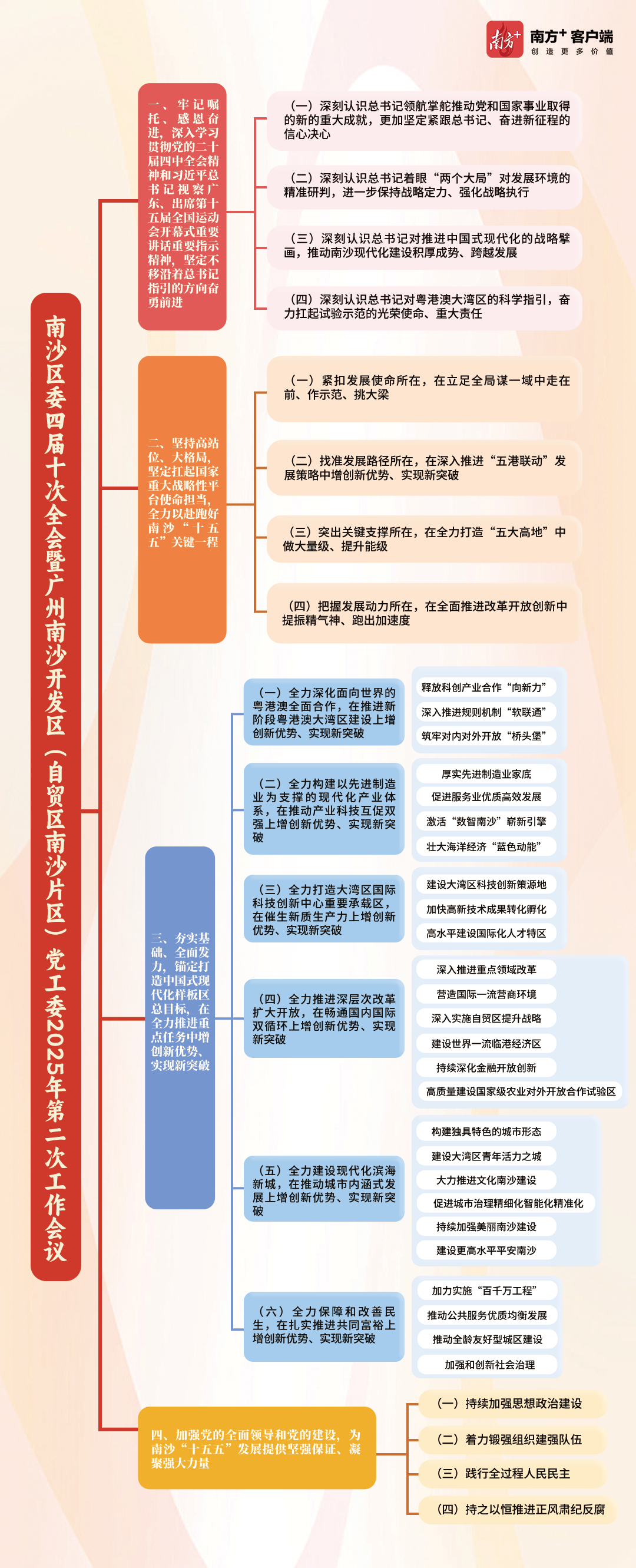 会议强调,要夯实基础、全面发力,锚定打造中国式现代化样板区总目标,在全力推进重点任务中增创新优势、实现新突破。要全力深化面向世界的粤港澳全面合作,在推进新阶段粤港澳大湾区建设上增创新优势、实现新突破,加快建设香港科技大学(广州)二期、环港科大(广州)创新区,打造国际创新创业社区,加快建设南沙(粤港澳)数据服务试验区,加强与国家重大区域战略联动。要全力构建以先进制造业为支撑的现代化产业体系,在推动产业科技互促双强上增创新优势、实现新突破,做强“陆海空”支柱产业集群,加快壮大新兴产业规模,超前谋划未来产业,打造高品质产业承载空间,筑牢数据基础设施底座,促进数据流通交易,培育发展数字产业,加快建设南方海洋科技创新中心,深化海洋保护开发利用,增强海洋综合治理效能。要全力打造大湾区国际科技创新中心重要承载区,在催生新质生产力上增创新优势、实现新突破,高标准建设南沙科学城,强化企业科技创新主体地位,加快高新技术成果转化孵化,善用科技金融活水,高水平建设国际化人才特区,深入开展“青出于南”等系列行动,实施更加积极开放有效的人才政策,持续提升人才出入境、停居留、跨境就业执业便利化水平。要全力推进深层次改革扩大开放,在畅通国内国际双循环上增创新优势、实现新突破,深入推进重点领域改革,落实好积极财政政策,营造国际一流营商环境,探索“高效办成一件事”,深化放宽市场准入与加强监管体制改革,大力支持民营经济,助力企业发展壮大,深入实施自贸区提升战略,稳步扩大制度型开放,深化通关便利化改革,建设世界一流临港经济区,持续深化金融开放创新,高质量建设国家级农业对外开放合作试验区。要全力建设现代化滨海新城,在推动城市内涵式发展上增创新优势、实现新突破,优化“一轴三带、一心四区、多点支撑”的组团式空间格局,建设大湾区青年活力之城,大力推进文化南沙建设,促进城市治理精细化智能化精准化,持续加强美丽南沙建设,建设更高水平平安南沙。要全力保障和改善民生,在扎实推进共同富裕上增创新优势、实现新突破,加力实施“百千万工程”,推动公共服务优质均衡发展,推动全龄友好型城区建设,加强和创新社会治理。